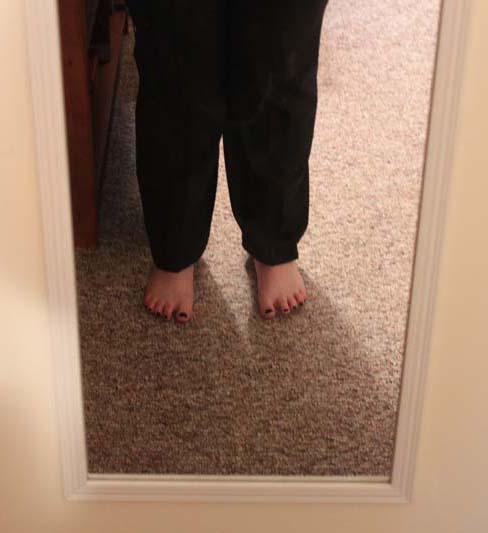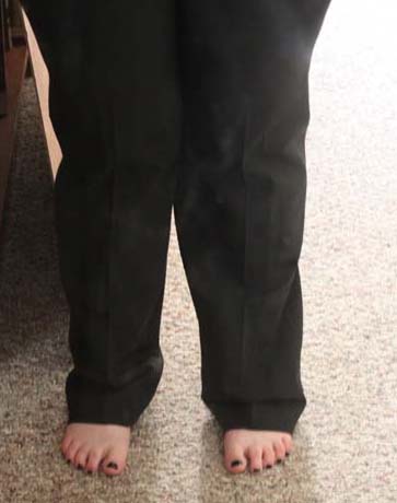– Try the pants on after every pinning! Try them on barefoot and in whatever shoes you wear most often. Both pant legs should hit the floor at the same point (anywhere you like but I prefer mine to just touch the floor behind my heel).