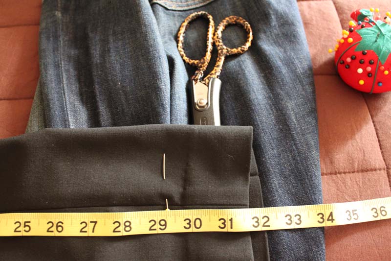 The first thing you need to do is figure out your inseam. The directions here are good and use my favorite method: finding the inseam of your favorite pair of pants. Mine is 29″ which I’ve marked with a pin below.