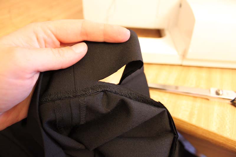 Then let her rip! Pick a point on the plate under the sewing foot to line up with (most machines have some preset lines) and use that as your guide all the way around. For dress pants I like to sew on the outside of the pants so I can see the progress. Lighter fabrics tend to tangle my bobbin and I’d rather that happen on the underside and not the top.