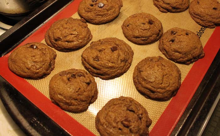 I baked my cookies on two cookie sheets, one lined with parchment paper and one lined with our silpat. Both produced a good result but I really do prefer the parchment paper. I baked them on two racks at a time, rotating after 5 minutes and taking them out after about 9-10 minutes. They looked and felt a little gooey but the bottoms were browned, after cooling on a cooling rack they set up perfectly.