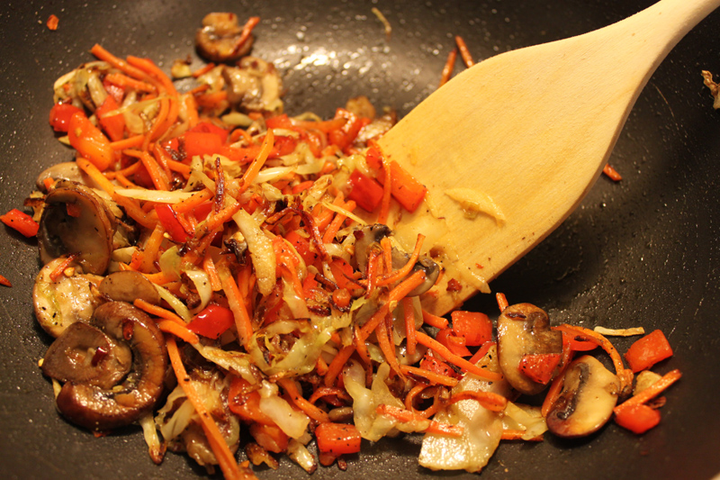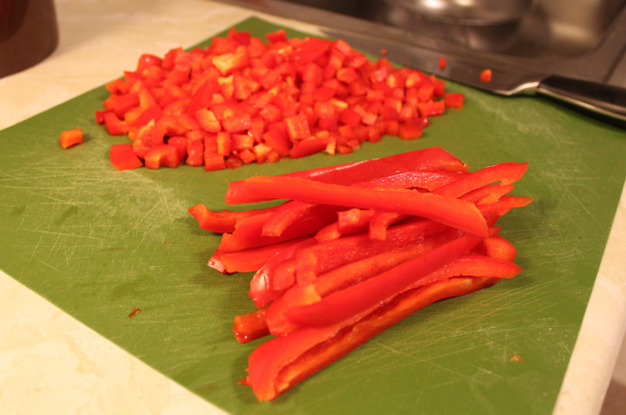 Ah, but sometimes you have to take some help from the store, as Rachael Ray would say, because breaking down carrots into slivers and shredding up cabbage seemed like slave labor compared to the rest of my lovely and restful long weekend. So the only thing I really had to chop up was these here red peppers:
