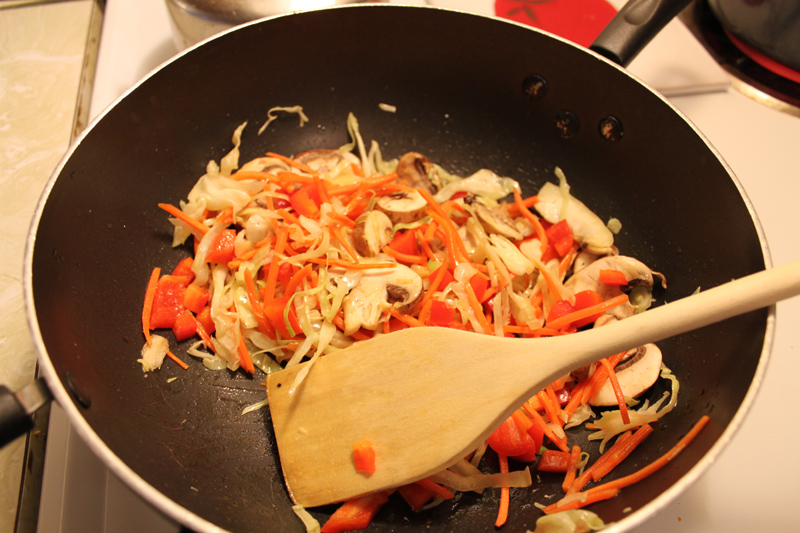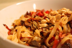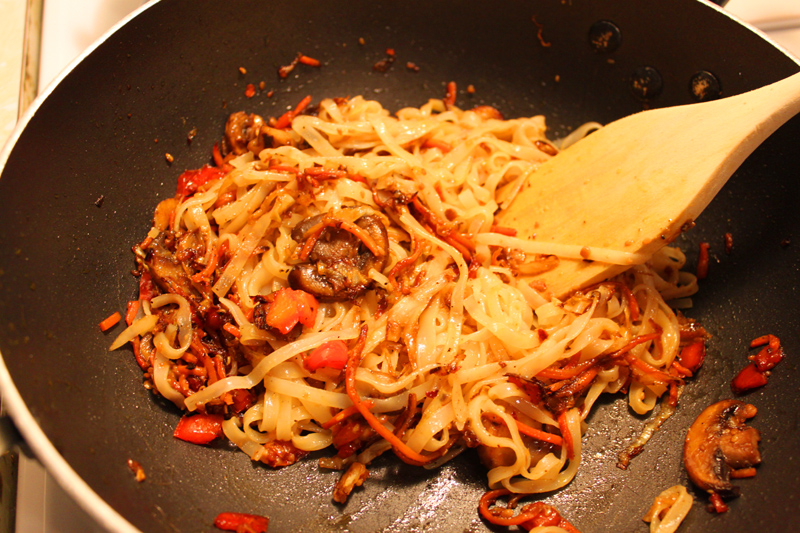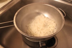 Time for rice noodles! These were a medium width noodle (at Whole Foods we found small, medium, and large width noodles) and probably took about 6-8 minutes to boil to the right texture.