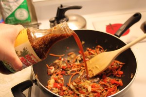 I added they soyaki sauce when the veggies were about 2/3 of the way done. I like soy sauce but I find right out of the bottle it’s too bitter. I like to let it cook down and meld for a while before I eat it.
