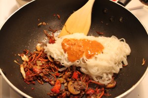 After draining I added the noodles and the satay peanut sauce to the saute pan and mixed together until it all looked uniform. Getting the noodles to cooperate was tough, I found using a knife and cutting them up a bit helped.