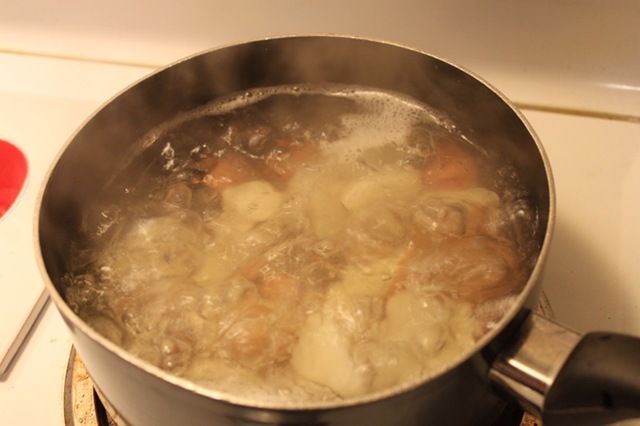 Boil water, chop your potatoes while you wait, boil potatoes until tender (10-15 minutes) then drain.