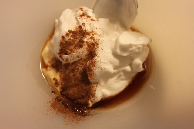 In a small bowl mix the greek yogurt, 2 tsp. of cinnamon, and vanilla. Also set aside for a bit.