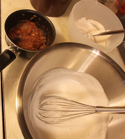 Once off the heat, add your gelatin mixture. Beat this together until the bowl has cooled to the touch. This took me about 8-10 minutes (ow my wrists) – the egg whites were frothy and gelatin had started to tighten everything together.