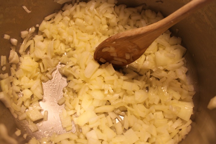 Chop your onion (I prefer mine super fine) and combine with butter or Smart Balance. Saute for 3-5 minutes.