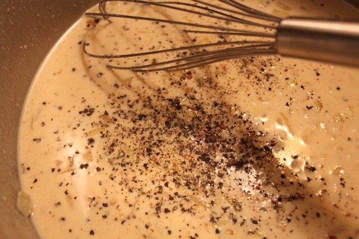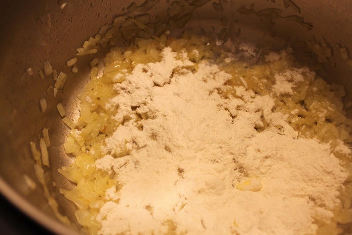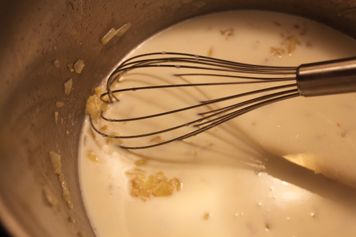 When the onions are done sprinkle on the flour and pour in your milk. Whisk right away! Keep whisking until everything is incorporated and there are no lumps of flour. Whisk away until the mixture starts to thicken. This whole process should take 8-10 minutes.