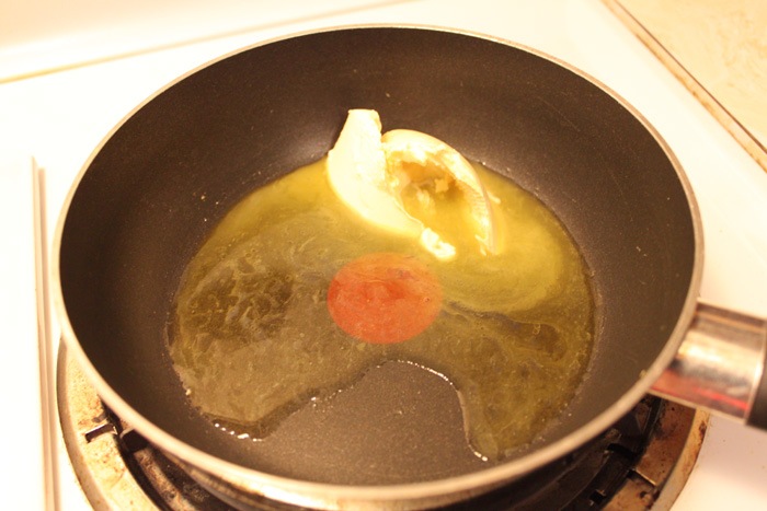 Drizzle in 1 tbsp. of black truffle oil. Saute onions until they are translucent and just turning brown.
