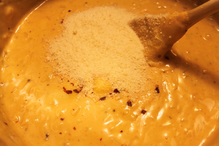 When the cheese is all melted taste for seasoning. This is where I added the parmesan cheese, red pepper flake, and a bit of salt.