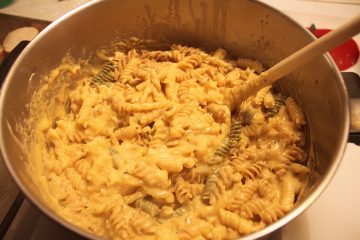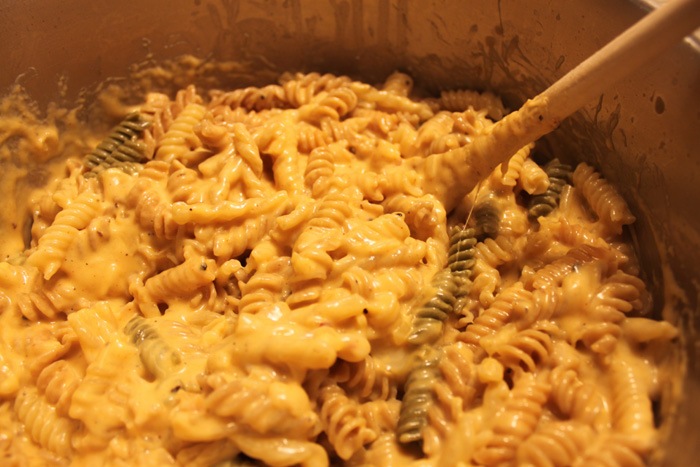 1.5 lbs. of dry pasta (your choice, I actually used all the leftover odds and ends we had laying around – whole wheat rotini, gemelli, some tri color too)