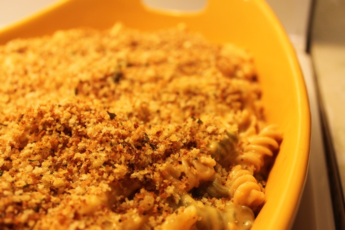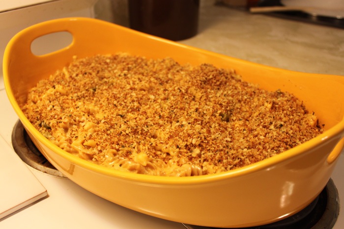 Pour the mac and cheese into an ovensafe dish that you can serve out of. Sprinkle toasted panko over the top. Keep in a 200 degree oven until you’re ready to serve.