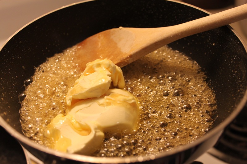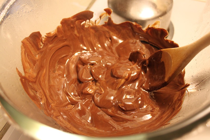 Melt 1 tbsp. butter, 4 oz. of chocolate, and 1 tbsp. agave over another double boiler.