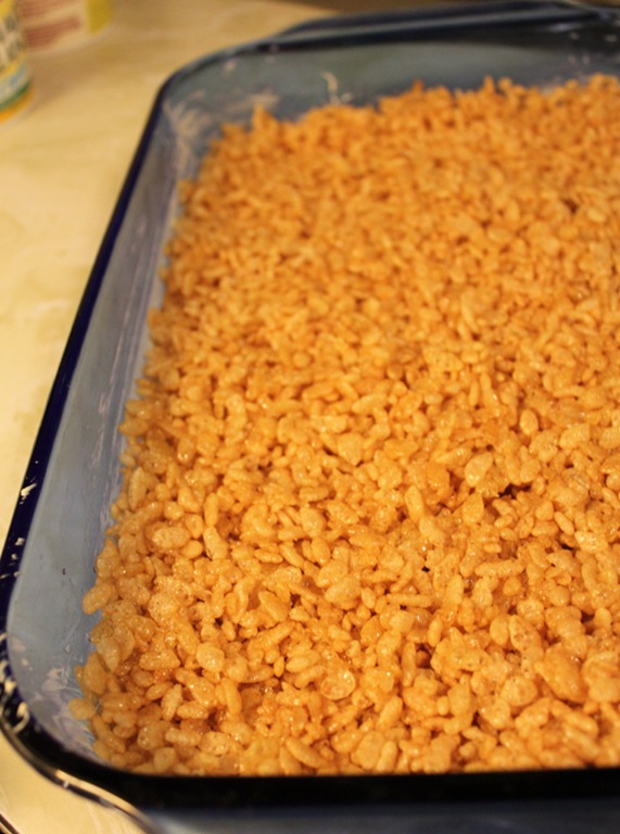 Once your salty, caramely, gooey, crispy cereal is in the pan, pop it in the fridge.