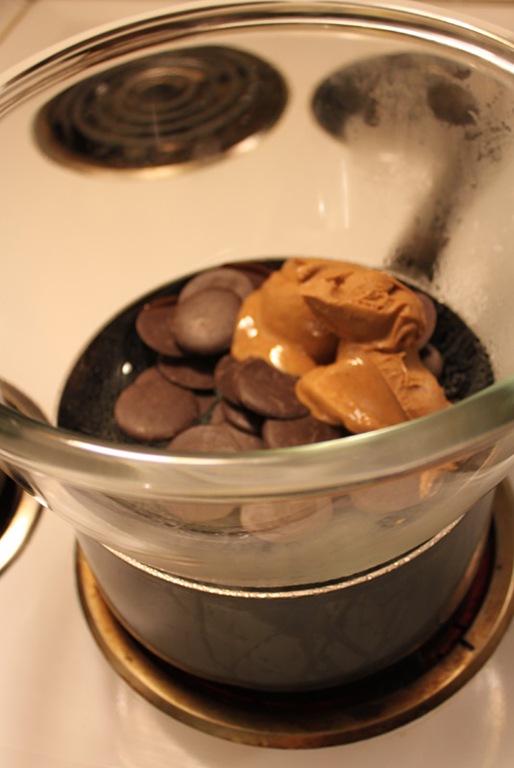 Next up: the peanut butter chocolate layer. Melt 6 oz. of chocolate and 1 cup of peanut butter over a double boiler.