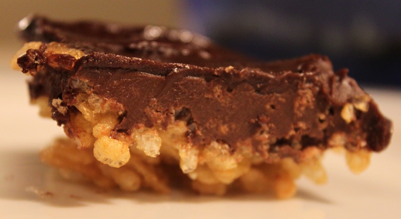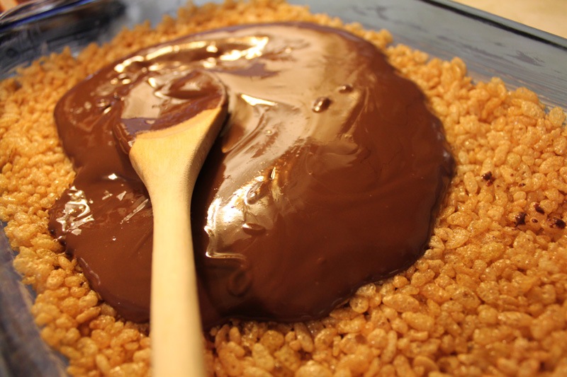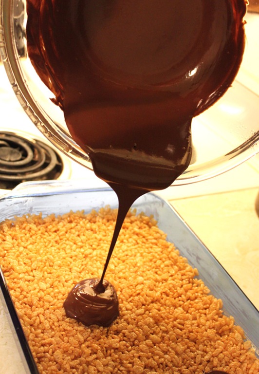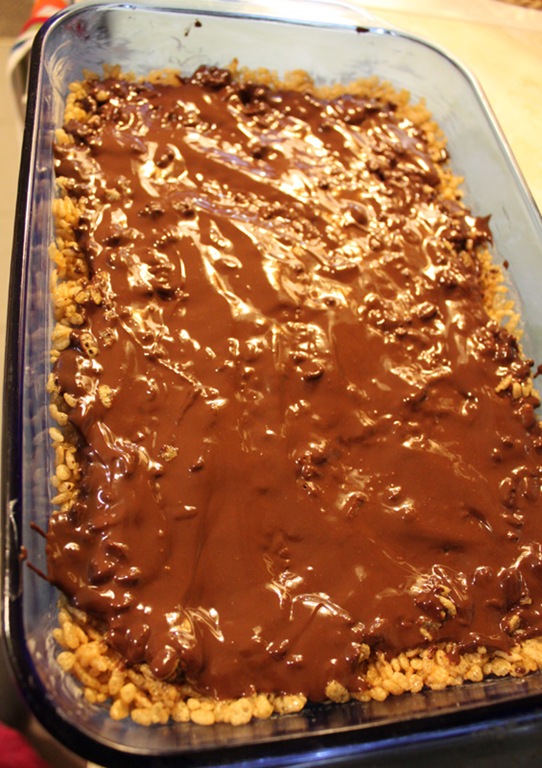 When your peanut butter/chocolate mixture is all melted pour it evenly over your chilled crispies. Pop that back in the fridge for at least 30 minutes. We want distinct layers of flavor here and everything has to be cooled down completely for that to happen.