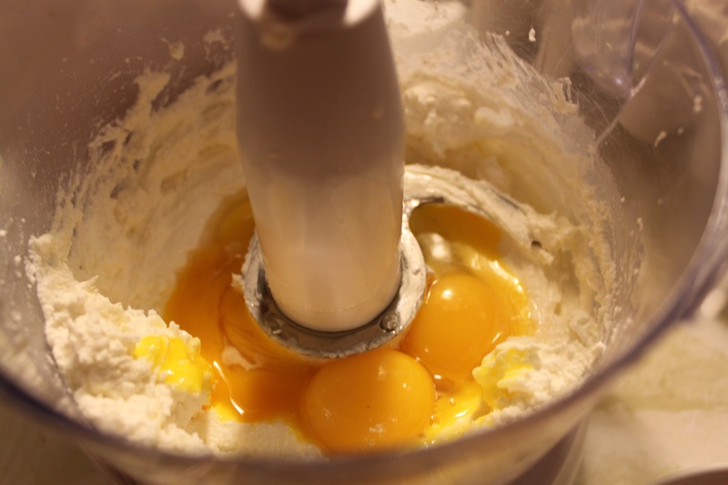 Combine ricotta, cream cheese, and eggs/egg yolks in your food pro. Scrape down the sides and make sure everything is mixed thoroughly. Next add your melted chocolate, again, scrape down the bowl and make sure it’s uniform. Finally add as much simple syrup as you like to bring the filling to your desired consistency. I used all of mine and it still was pretty thick. Silky and smooth, yet thick and decadent.