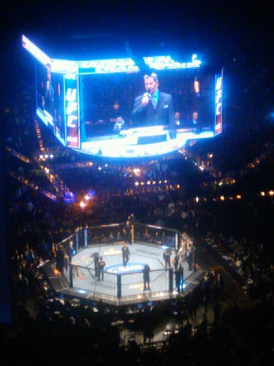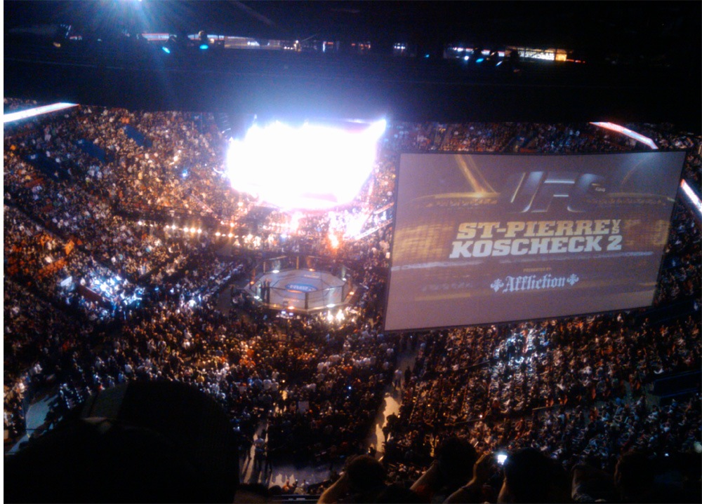 After 10 prior fights, the main event finally started at about 11:30PM: George St. Pierre vs. Josh Koscheck. GSP started his assault immediately, closing up Kos’ right eye in the first round. The rest of the fight was a lot of pummeling in short bursts, little aggression from either side which I thought was surprising, but a great demonstration of GSP’s skill and versatility. Plus, the crowd went nuts for him for 30 straight minutes. The energy was amazing.