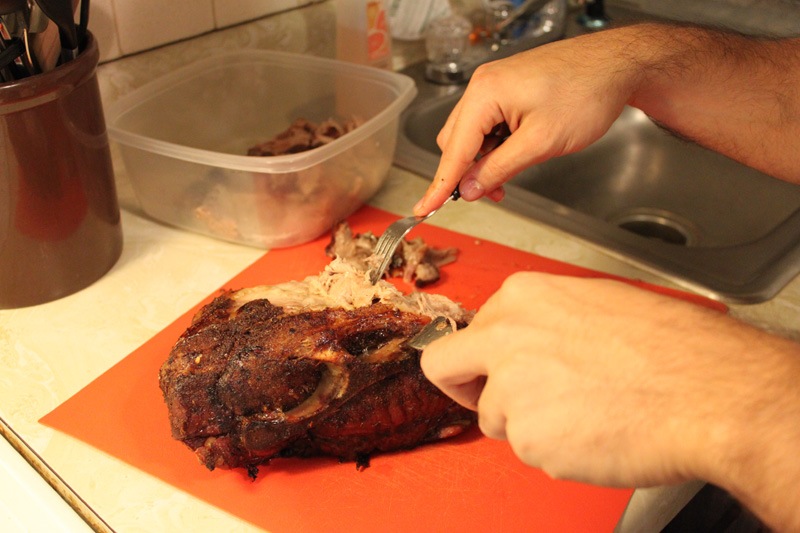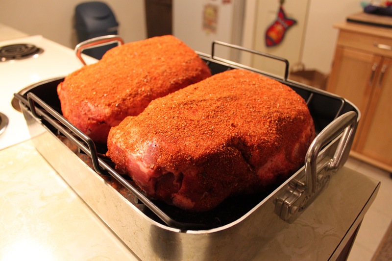 Two 7 lb. bone-in pork shoulders (we prefer bone in because it allows the pork to adhere to something while cooking, if we went with boneless for 12 hours I fear the pork would just crumble apart)