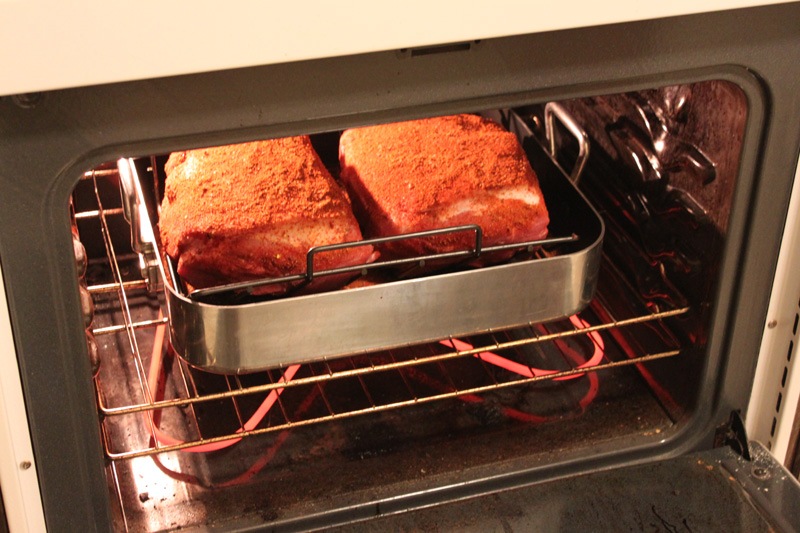 Place your pork shoulders in a big roasting pan on a rack. They shouldn’t be touching and they need to be elevated off the bottom of the pan so the fat can drip off. Combine the rub ingredients in one container and then mix thoroughly. Rub your pork shoulders (every little nook and cranny) with all of the rub. Slow cook in the oven at 250 degrees for 12 hours (we usually let it go overnight). When it’s done take the pork out of the oven and let it rest for 1 hour. Use two forks, or your hands, to pull apart the pork into whatever size shred you like.