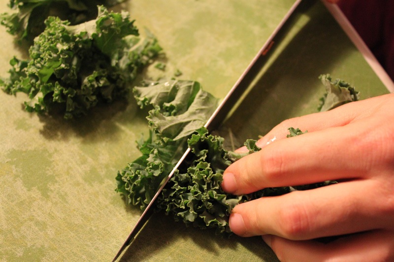 To break down your kale: Fold in half along the interior rib, cut the rib out, keep the kale folded in half, and then chop into bite sized leaves. I broke all of my kale down for the week and put in a big tupperware container. Huge time saver!