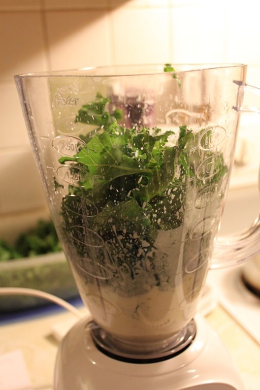 Now onto the greens! Add your kale, blend, then add spinach. They will blend up smooth, don’t worry about chunks! If your blender needs a little help, push the greens down then splash some more soymilk on top.