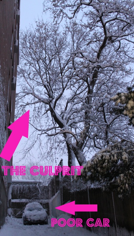 I’m really worried about the tree the limb fell from though. Clearly the branches are really heavy with snow and I am nervous that more will fall overnight. I would have moved my car but every single spot in our lot was taken and there are no street spots left. Ugh, we’ll see what happens tomorrow!