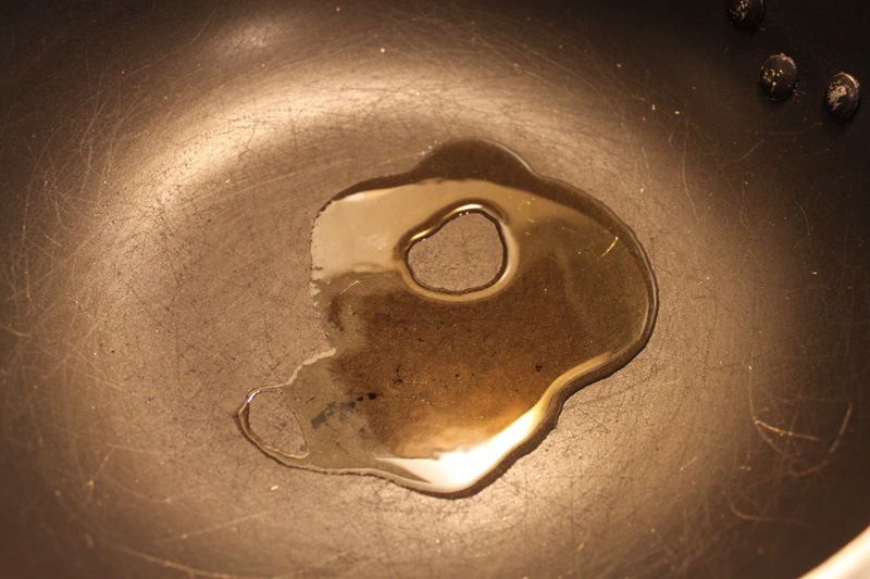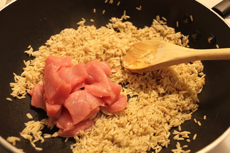To start your PFR: Heat up 1 tbsp. of EVOO over medium-high heat and “fry” your rice in it. You just want to brown the rice a little, giving it a crispy texture. Stir continuously though here, you don’t want to burn it!