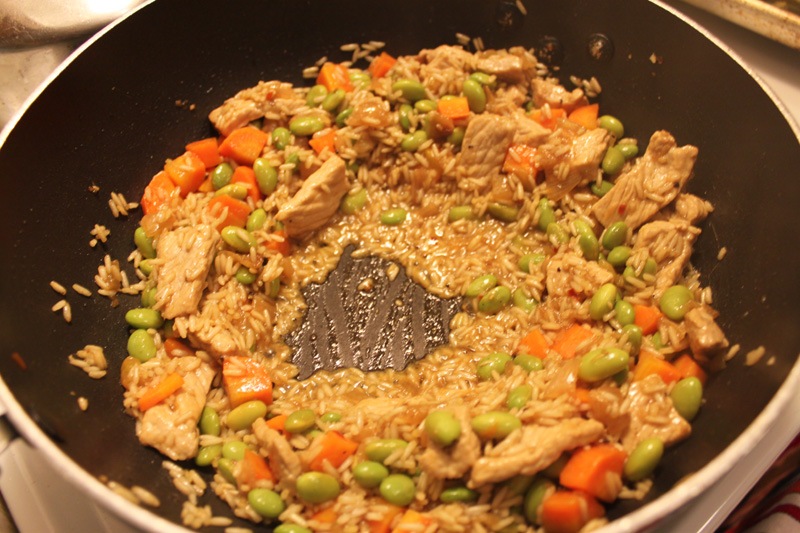 Next add in your carrots and edamame. You may want to add in a half a cup of water here to help soften your carrots and thaw the edamame quicker. Cook for about 5 minutes.