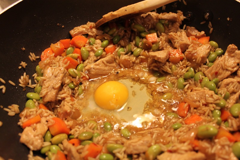 Next up, the egg! Make a little well in your rice mixture, crack the egg into it, break the yolk quickly, and stir the cooking egg thoroughly into your rice mixture. Cook for 2-3 minutes and stir for uniformity.
