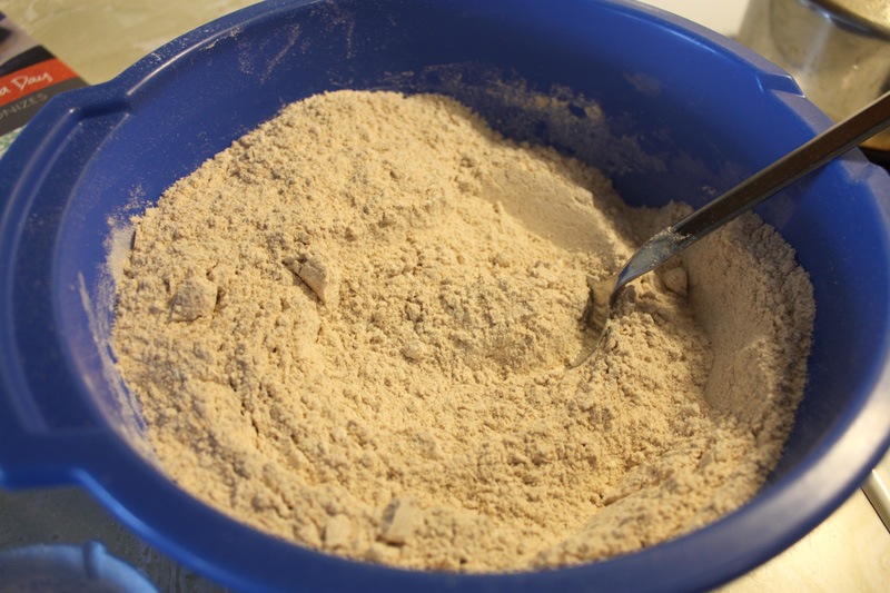 Get your flours, yeast, and salt in one bowl and mix together to combine.