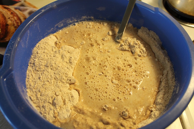 Next add your 3 cups of lukewarm water. My method is to add 2 cups and then stir in with a spoon as much as I can. I slowly add the third cup of water while kneading the rest with my hands to combine.