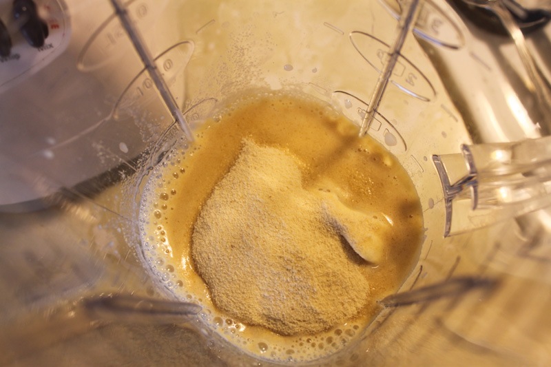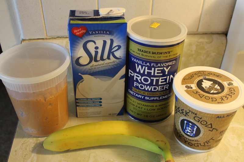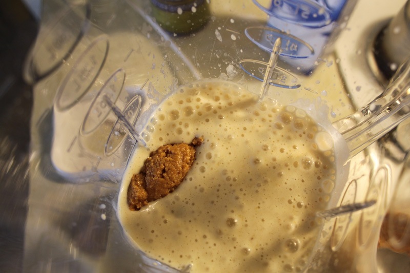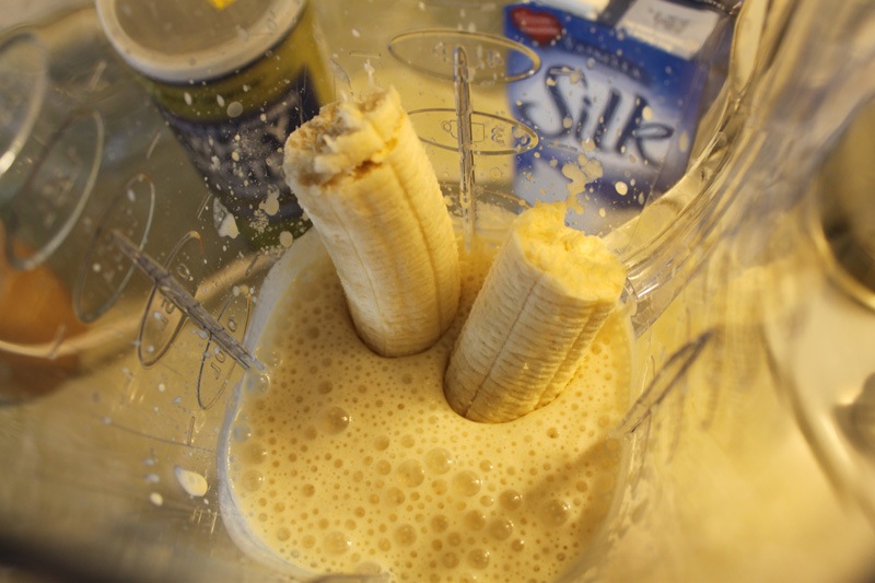 First into the blender is the greek yogurt, soymilk, and protein powder. Blend for a few seconds.