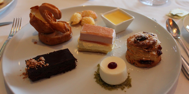 Last but not least is the petit fours and pastries course. Pictured here is the traditional pastry swan with espresso chantilly, chocolate decadence cake with candied white chocolate, buttermilk panna cotta over green tea crumbles, a cherry apricot scone, madelines with lemon curd, and a grapefruit and whipped cream cake with gelatin layer.