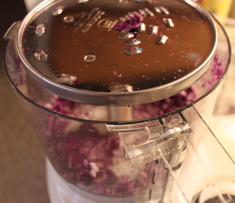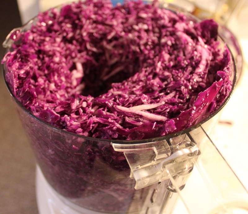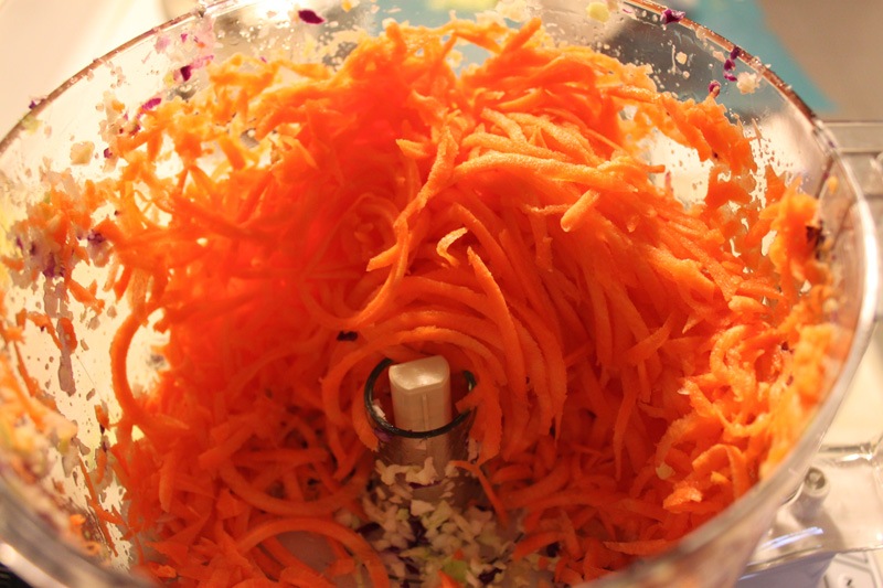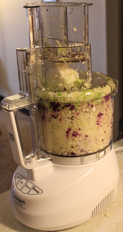 Next, hook up the shredding disc attachment on your food processor. Your manual’s instructions may differ from mine but I feed my veggies through the top and press down with the removable plastic plunger thingy (here’s where pictures help!).