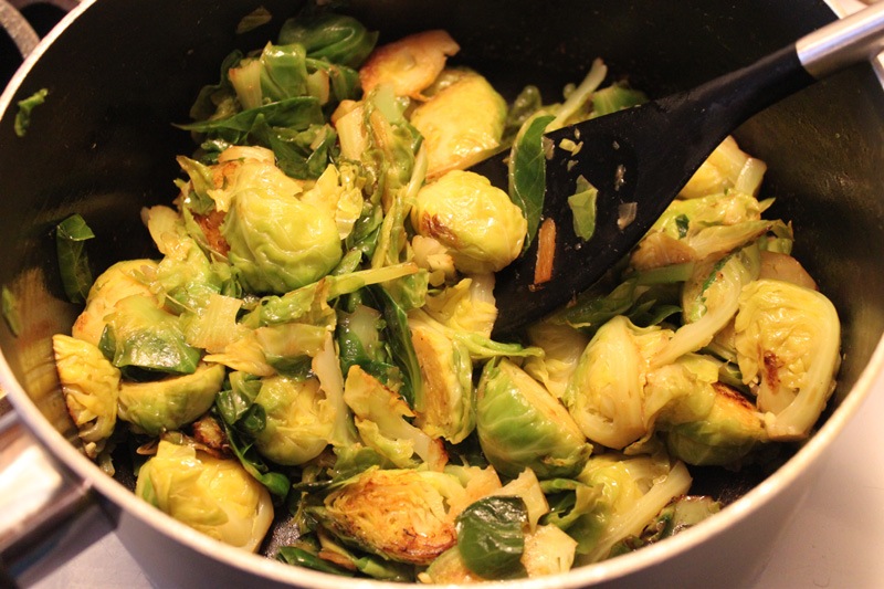 As the stock cooks out and your pan gets dry, add in your EVOO and sautee up your sprouts and their leaves. A nice brown color is what you’re looking for here.