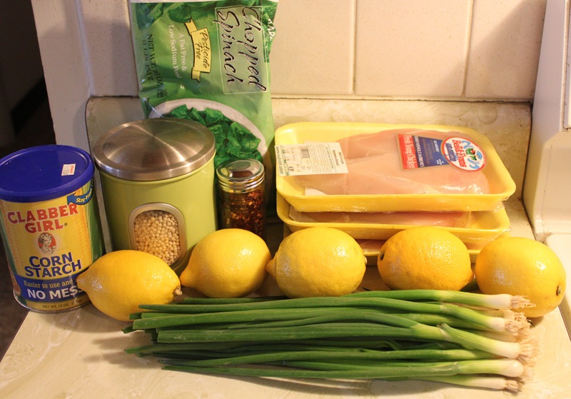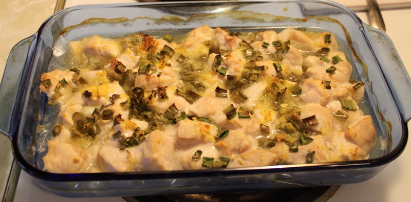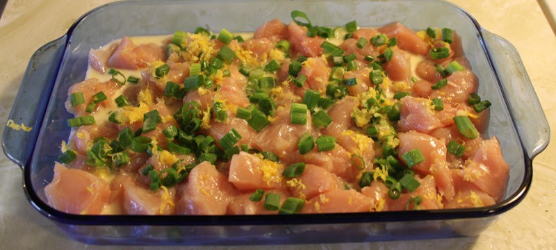 Next: the chicken. Cube your chicken and place in a baking dish. Combine 1 cup of lemon juice with 2 tsp. of cornstarch. Mix to combine thoroughly. The cornstarch will give you a nice sauce for your chicken to cook in. Mine came out super moist, tender, and packed with flavor. Sprinkle about 2-3 tbsp. of your scallions and 1-2 tbsp. of your lemon zest over the chicken. Then pour your cornstarch juice over it all and bake at 350 degrees for 35 minutes.