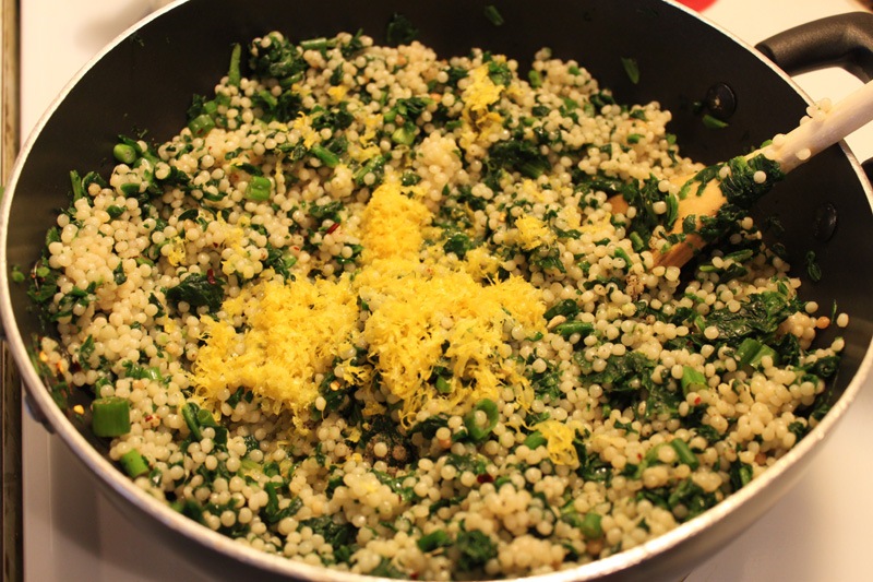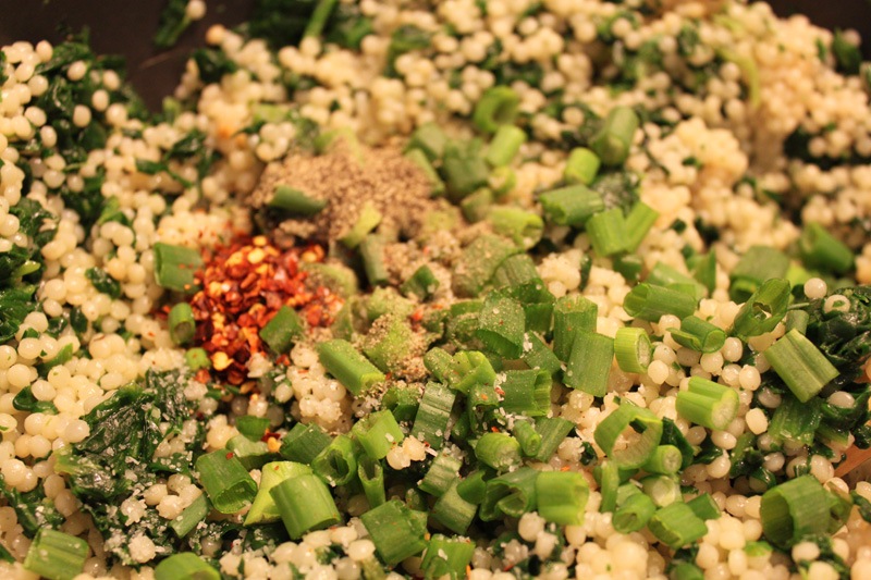 When your couscous and spinach are done, combine in a big pot or pan. Add in your red pepper flake, 1-2 tbsp. scallions, salt, and pepper. Mix to combine and taste for seasoning. Once you have that done, add in about 1 cup of the lemon juice and 2 tbsp. of the zest (depending on your preferences). Mix thoroughly. Taste again for seasoning and adjust if you need to.