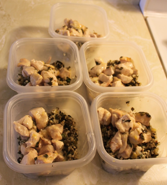 Spoon the lemony spinach couscous into 5 tupperware containers. Portion out the chicken and place on top. And voila, five lunches for your work week!