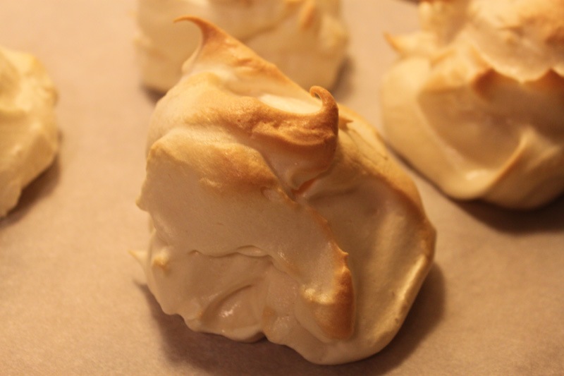 Spoon your meringue into any shape you want on parchment paper on any baking sheet (I used my pizza stone because I had it out) and bake for 20 minutes at 250 degrees. When the tops are nice and brown your meringues are done!