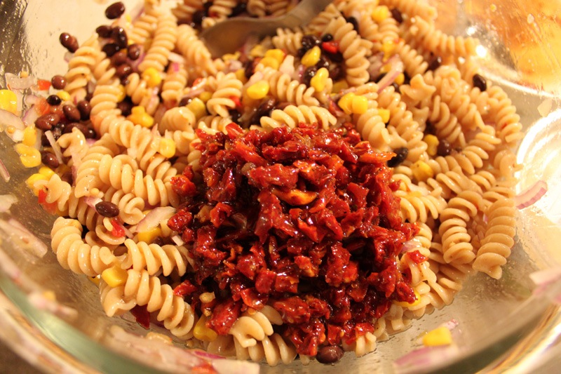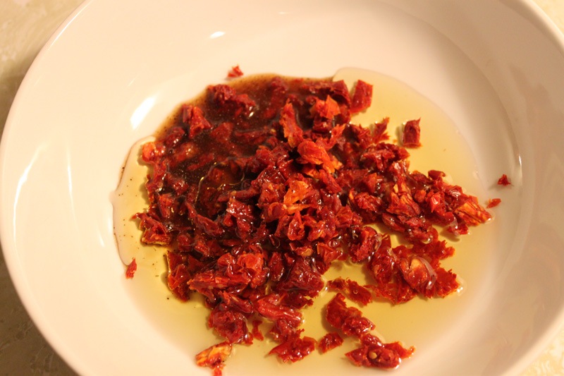 While your pasta is cooking make your dressing. Chop up your sundried tomatoes into small pieces. In one bowl combine the sundried tomatoes, balsamic vinaigrette, EVOO, and pepper. Let this sit by itself for 10-15 minutes so the flavors combine.