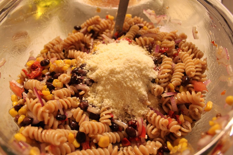 Then add your black beans (don’t forget to rinse them!), dressing mixture, and parmesan cheese, mixing after each is added.
