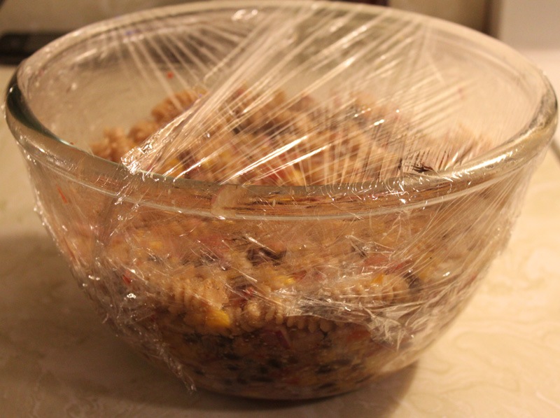 When your pasta is done rinse it in cold water to bring the temperature down. Combine your pasta and all of your veggies in a big bowl and stir to thoroughly combine.