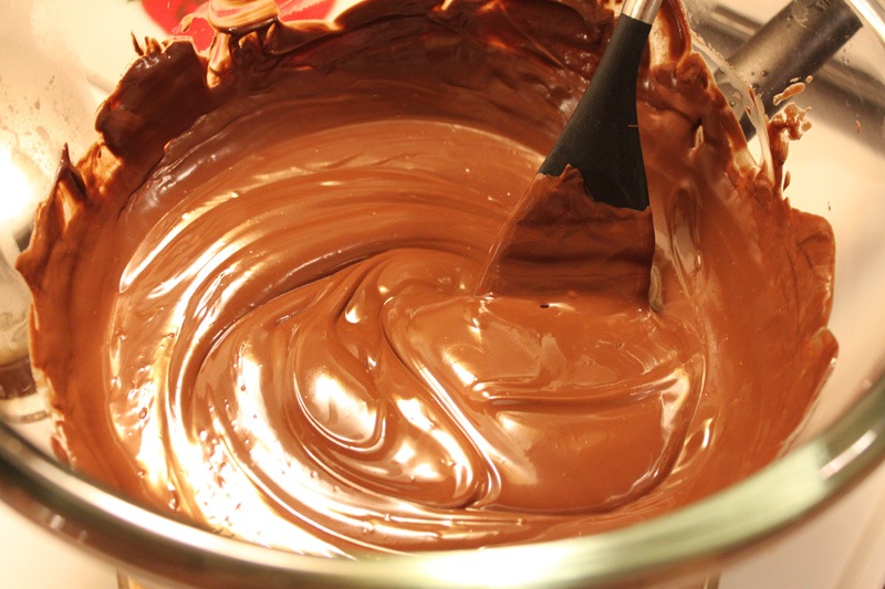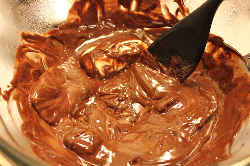 Add a few pieces of chocolate and all of the butter to start. As the chocolate and butter melt together, continually stir. Keep adding your chocolate in until it’s all melted into a smooth mixture.