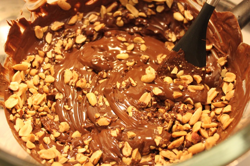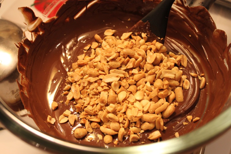 When your chocolate is totally melted add your chopped peanuts and mix in thoroughly.