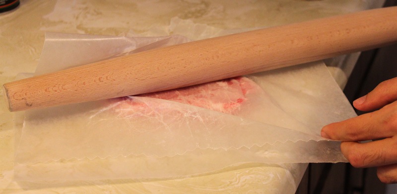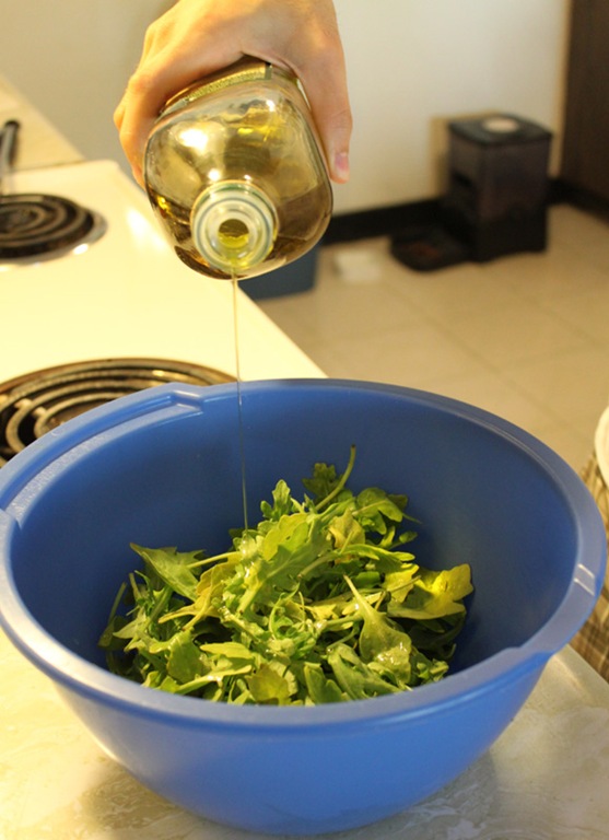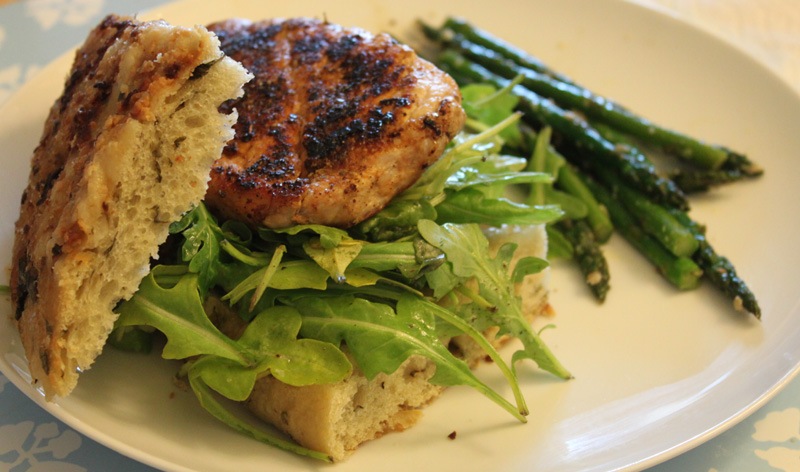 While our chops cooked with made a little arugula salad (just tossed with lemon juice, EVOO, and salt and pepper) and cut our bread.