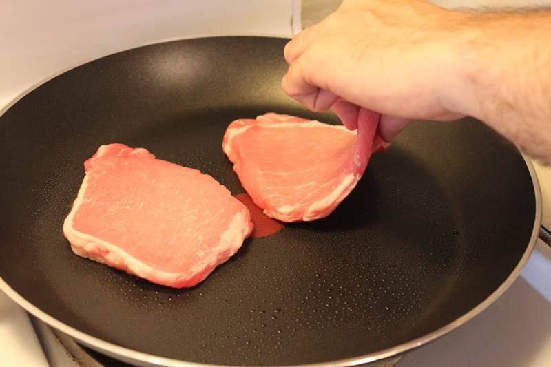 If you buy regular sized pork chops like we did, pound them out thinner between two pieces of wax paper. Cook in a non-stick skilled with a little cooking spray. Season any way you like though we used salt, pepper, and a little chili powder. Flip sparingly. The chops took about 15-20 minutes, covered with tinfoil for the the last 10 or so minutes .