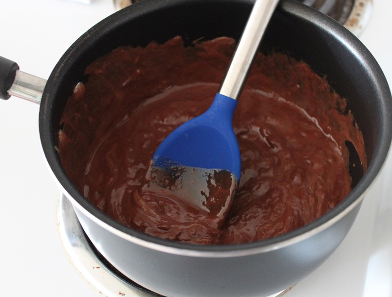 To begin, I got to melting my chocolate and butter together in a saucepan over low heat.