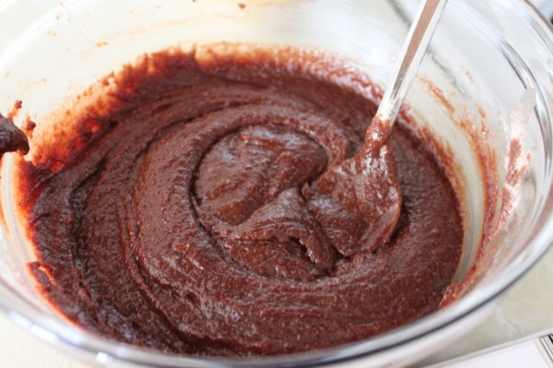 I then slowly stirred in the melted chocolate/butter mixture to the dry ingredients. Next I added my two eggs and stirred in. This batter was thick though; I also stirred in a tablespoon or two of water.